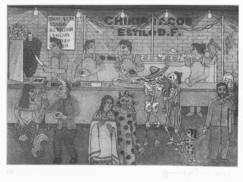 Israel Campos, Chikis Tacos, 2021, Etching & Aquatint